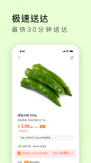 产地直采:专业买手团队深入全国优质产区,精挑细选当季最新鲜的生鲜果蔬,确保每一份食材都来自最佳产地。严格品控:平台组建了专业的质检团队,从采购到配送的每一道环节都建立了严格的品控标准,通过多重检测确保食材安全优质。最快30分钟达:依托美团强大的即时配送网络,在距离线下门店1.5公里范围内提供闪电配送服务,让新鲜食材快速直达厨房。3元起送:超低的起送门槛让用户即使只购买少量食材也能享受配送服务。9.9元免配送费:单笔订单实际支付金额满9.9元即可免除运费,让用户享受更实惠的购物体验。