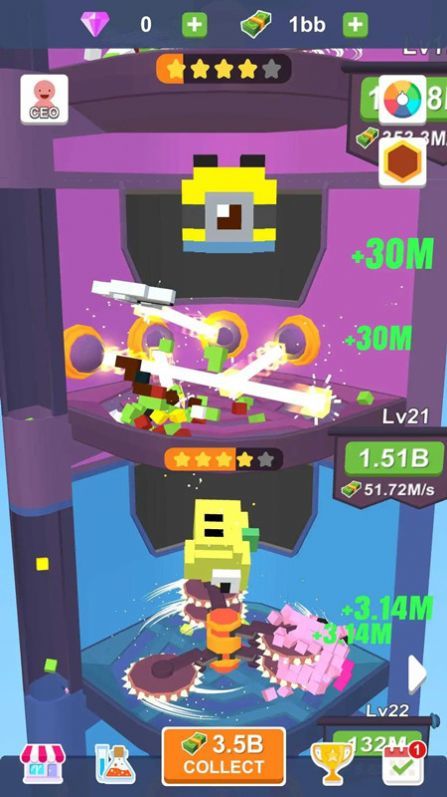 需滑动屏幕控制粉碎机的上下移动,拖动像素块进行相同色块的碎片,然后完成目标任务。直观的操作方式让游戏易于上手但难以精通。