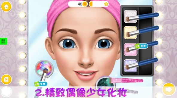 游戏提供了丰富的化妆模拟玩法,从眼影、唇彩到腮红,每一款妆容都能展现独特风格。画面精致细腻,色彩搭配多样,让你的创意无限发挥。无论是清新自然的日常妆,还是华丽闪耀的舞台妆,都能轻松打造,让你的公主焕发迷人光彩。