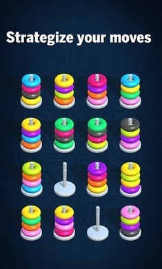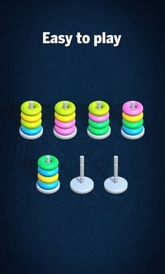 玩家需要在限定时间内完成圆环排序,争取获得更高分数和排名。游戏规则简单明了,无需复杂教程就能轻松上手。独特的堆叠机制要求玩家只能将相同颜色的圆环放在一起,增加了游戏的策略性和挑战性。
