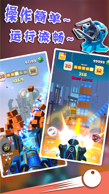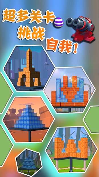 游戏强调装备搭配的重要性,只有将强力的大炮与合适的炮弹组合,才能发挥最大威力,轻松击碎各种坚固的障碍物。游戏优化出色,运行极其流畅,即使是在施展华丽的开炮特效时,也不会出现卡顿现象。除了常规的墙体障碍外,游戏还设计了多种有趣的建筑目标,如中世纪城堡、钢铁高塔等,每个关卡都能带来新鲜感。随着游戏进程的推进,玩家将解锁更多特殊炮弹,如爆炸弹、冰冻弹等,让破坏体验更加多样化。