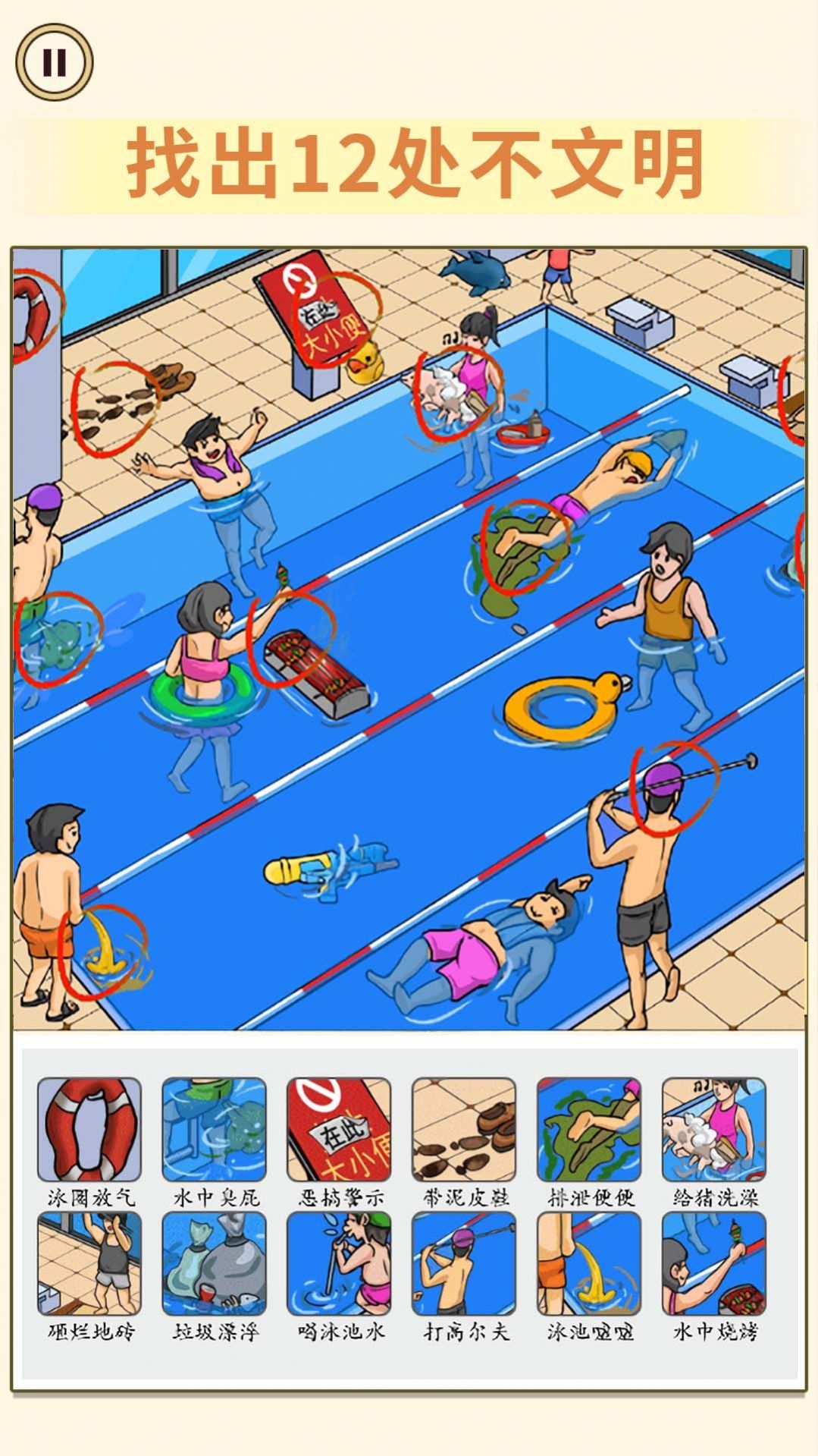 《找出不文明》是一款寓教于乐的找茬类益智游戏,拥有丰富的关卡设计和多样化的玩法模式。游戏中的背景音乐舒缓悠扬,能有效帮助玩家集中注意力,在轻松的氛围中寻找画面中的不文明行为。每张游戏图片都经过精心绘制,不仅色彩鲜明、细节丰富,还融入了独特的艺术风格和鲜明的主题特色。游戏特别注重教育意义,通过生动有趣的场景设计,潜移默化地培养玩家的文明意识。无论是画面表现力还是游戏内涵,都达到了同类游戏中的较高水准。