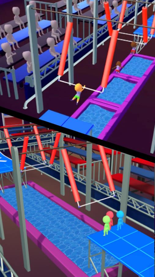 玩家需要控制角色在绳子之间的缝隙中跳跃、滑行;精准的时机把握是成功的关键,需要观察地形变化提前做好准备。