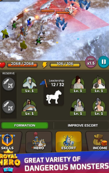 放置皇家英雄合并是一款充满策略与冒险的创新型游戏,玩家将在这个奇幻的世界中扮演一位勇敢的骑手,带领自己的护卫队展开一段惊心动魄的旅程。游戏融合了放置玩法、角色扮演和策略战斗等元素,为玩家带来前所未有的游戏体验。从普通的小怪物到史诗级的强大boss,你将面对各种不同类型的敌人,需要运用智慧和策略来培养和提升你的护卫队,制定独特的战术,并合理管理资源,才能在激烈的战斗中取得最终胜利。