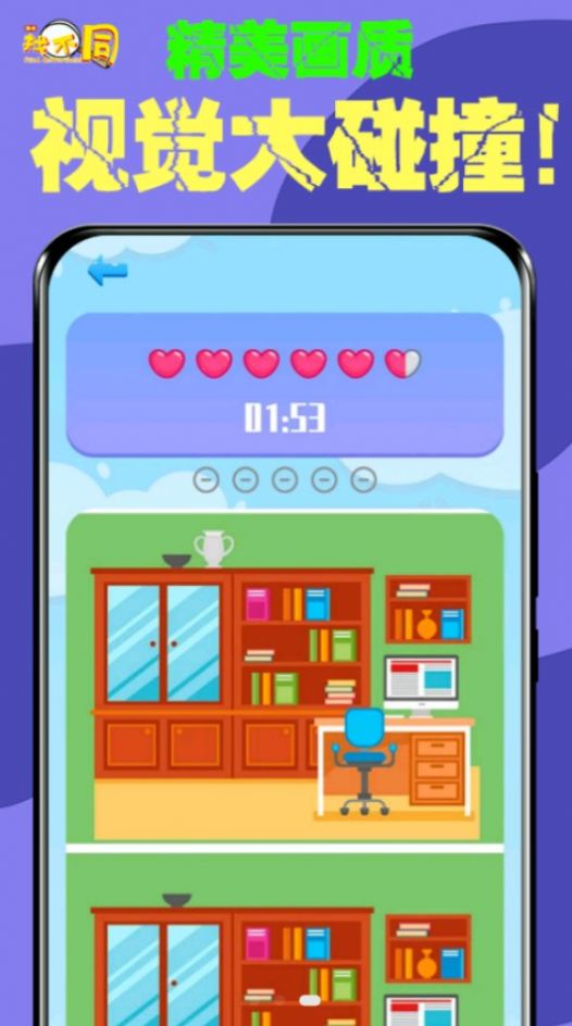 游戏提供了丰富多样的任务模式,操作方式简单易学,让玩家能够快速掌握游戏要领。经典的闯关玩法让老玩家倍感亲切,同时也能让新玩家快速适应。随着关卡推进,图片的复杂程度会逐步提升,从简单的几处差异到需要仔细观察的细微差别,挑战性也随之增加。部分关卡还设有时间限制,为游戏增添了紧张刺激的元素,考验玩家在压力下的观察力和反应速度。