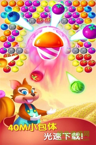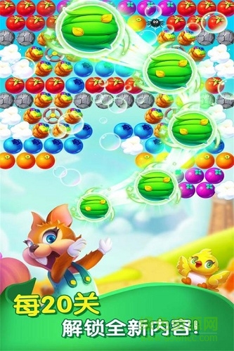 《泡泡农场大作战》是一款融合了泡泡龙玩法与农场经营元素的创新休闲游戏。故事发生在一个神奇的森林里,邪恶的魔法泡泡将小鸟们和美味的水果泡泡都困住了。作为勇敢的小松鼠,你将肩负起拯救森林的重任。在冒险过程中,你不仅要消除泡泡解救小鸟,还需要收集珍贵的水滴来浇灌田园和农场。这些水滴能让农场产出更多水果泡泡,为你提供闯关所需的弹药。游戏设计了丰富多样的关卡场景,从阳光明媚的果园到神秘的魔法森林,每个场景都充满惊喜。你准备好帮助小松鼠完成这场充满挑战的冒险了吗?让我们一起踏上这段既温馨又刺激的旅程!