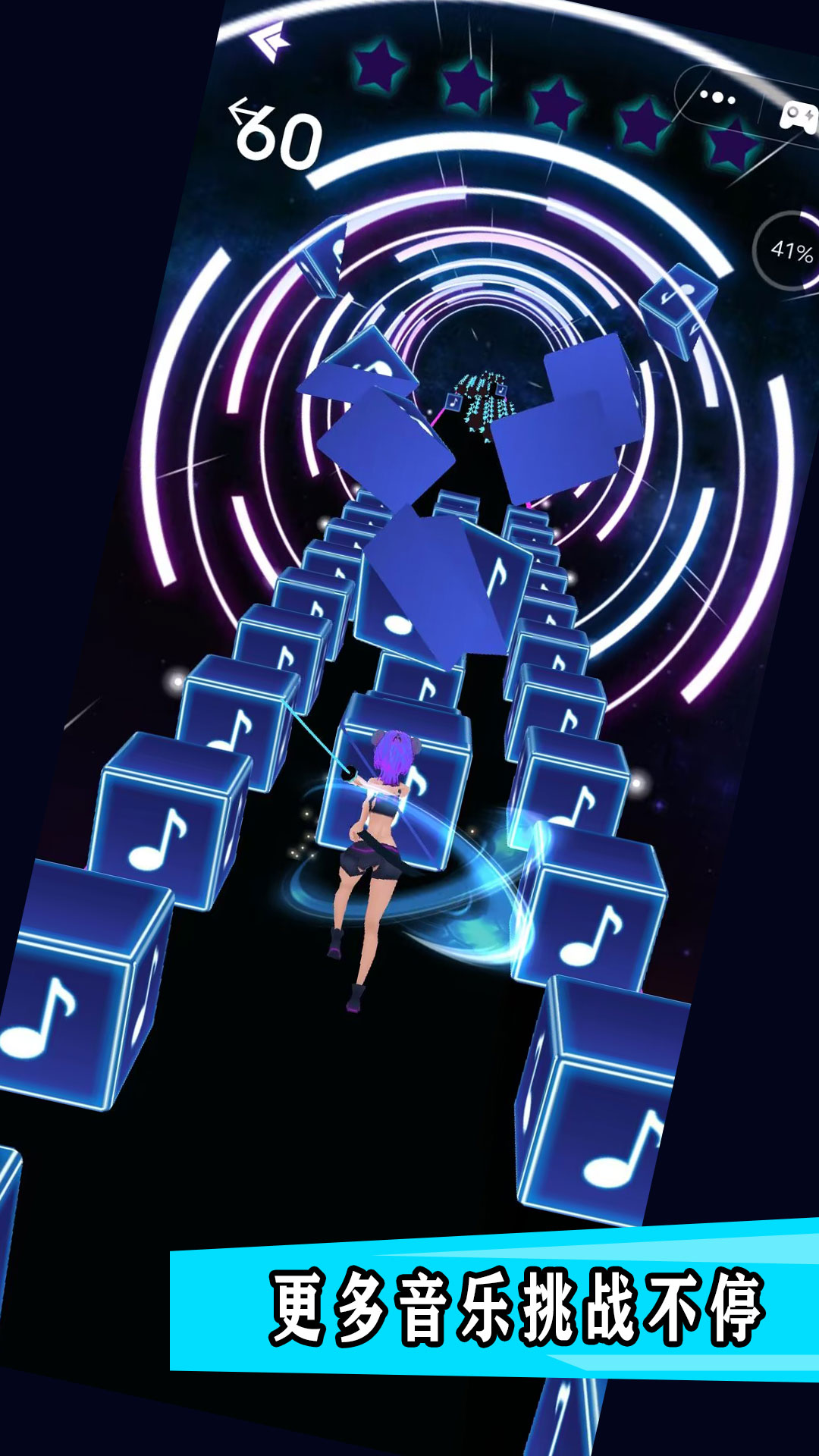 内置了大量优质音乐资源,涵盖流行、舞曲、摇滚、嘻哈等多种音乐风格,满足不同玩家的音乐品味;玩家可以自由选择喜欢的歌曲进行游戏挑战,通过完成关卡获得成就点数,逐步解锁更多隐藏曲目;游戏创新性地加入了节奏变化、乱序挑战等特殊玩法,大大提升了游戏的可玩性和挑战性,让每次游戏都充满新鲜感。