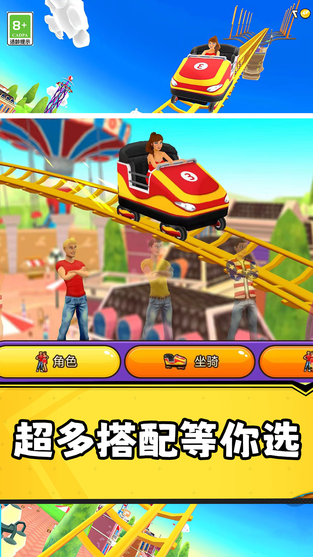 游戏提供了多种不同的过山车轨道设计,从经典的木质过山车到未来感十足的钢铁巨兽,每一种都能带给你独特的体验。你可以选择不同的视角进行游戏,包括第一人称视角,让你以乘客的视角感受每一次惊险的转弯和俯冲;或者选择第三人称视角,欣赏过山车在复杂轨道上飞驰的壮观景象。