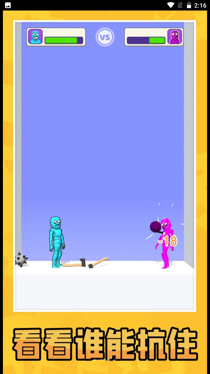 在迷你双人对决中,你可以使用数十种脑洞大开的武器道具,从传统的刀剑到搞笑的香蕉皮、臭袜子,甚至是会爆炸的生日蛋糕!通过灵活的操作和独特的战术组合,用最有趣的方式击败对手。游戏特别强调"欢乐竞技"的理念,胜利不仅取决于技术,更在于谁能用最富创意的方式让对手出糗。每场对战都充满意外惊喜,让你和好友在笑声中享受竞技的乐趣。