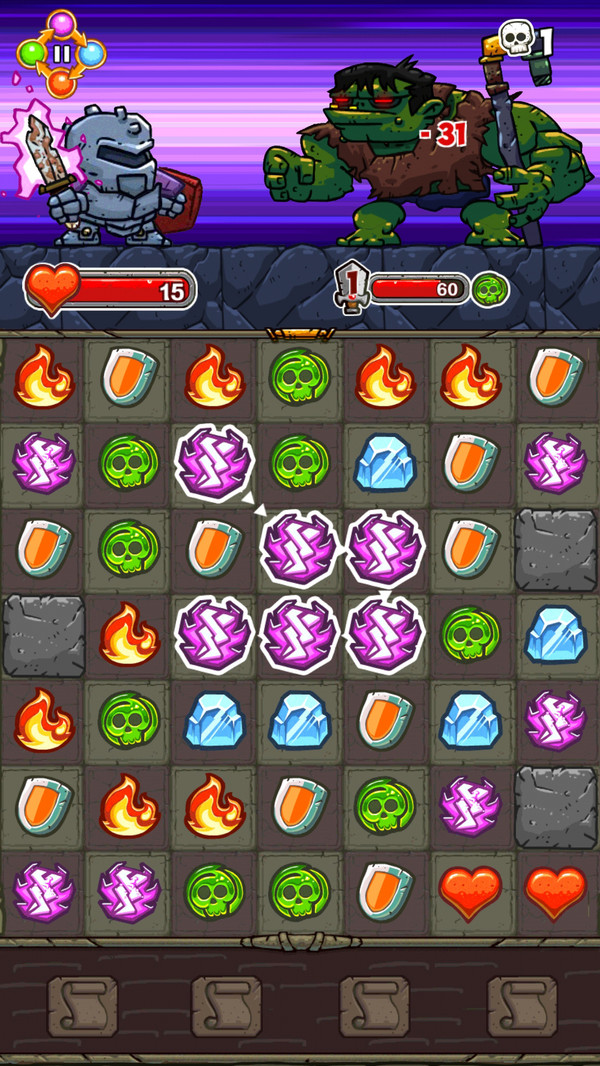 王牌骑士地下城最引人注目的特点就是其创新的双屏玩法设计。游戏将传统RPG与益智消除玩法完美融合,创造出了独特的游戏体验。上屏采用经典的RPG战斗模式,玩家可以释放各种炫酷技能,解锁新的剧情关卡;下屏则是充满策略性的消除玩法,玩家需要通过消除地下城底部的装备来为角色输送各种强力技能和增益效果。这种创新的玩法设计不仅增加了游戏的策略深度,也让战斗过程更加紧张刺激。此外,游戏还拥有丰富的装备系统,每件装备都能为角色带来不同的属性加成,玩家需要根据战况灵活调整装备组合。