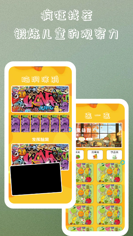 《疯狂脑洞大挑战》是一款集观察力与创造力于一体的趣味解谜游戏,带你进入一个充满惊喜的脑力激荡世界。在这里,你不仅能通过"找不同"锻炼火眼金睛,还能在涂鸦模式中天马行空,更有创意连连看等你来挑战。游戏采用清新明快的卡通风格,配合由浅入深的关卡设计,让每位玩家都能找到属于自己的解谜节奏。无论是想放松心情还是挑战自我,这款游戏都能带来持续的新鲜感和成就感。