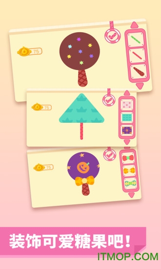 超多模具,打造独特形状的糖果。闪闪发光的糖果碎屑、可爱的糖果棒、精美的糖果蝴蝶结,搭配漂亮的糖纸,让宝宝装扮属于自己的精美创意糖果~装饰系统支持多层叠加,孩子可以尽情发挥创意;