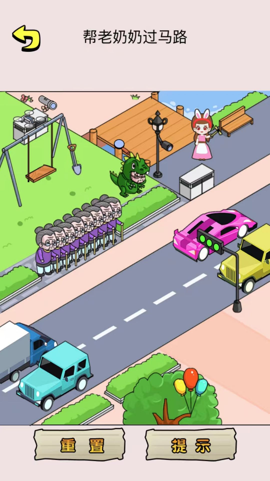 首先拖动天上的老鹰给老奶奶,让她飞过街道;然后将旁边工地上施工员的钻头拖给老奶奶,挖地道过去;接着将老奶奶拖动至塔吊的钩子上吊过去;将工地上的监控拖给红绿灯,装上监控后车辆会暂停;将红绿灯下方的线接到电箱短路,变成红灯;将一个老奶奶拖动到跷跷板上,再将另一个老奶奶拖动到跷跷板上,将老奶奶发射出去;拖动施工员的锤子敲出砖块建天桥;最后用窜天猴送老奶奶飞过马路。
