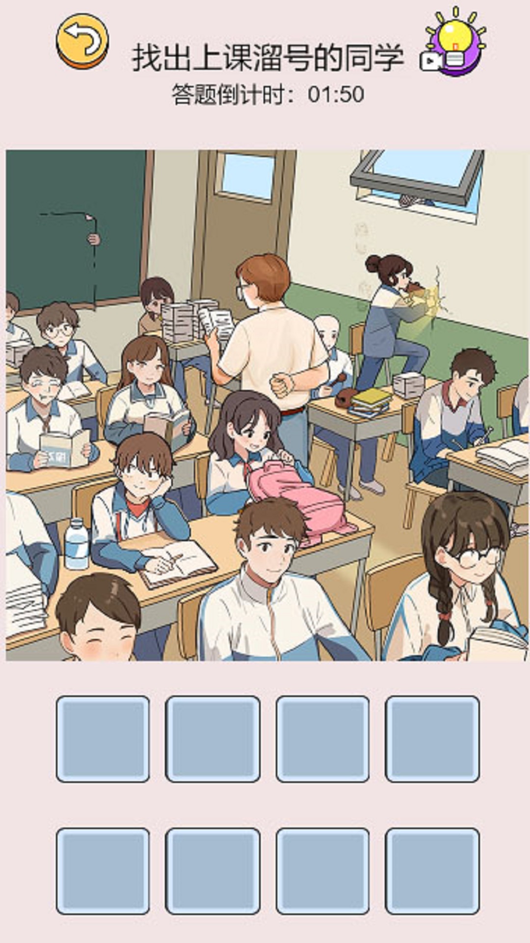 关卡中隐藏着多种作弊行为:膏药小抄、橡胶人、三头六臂、返璞归真等。向下滑动第二排左侧女生胳膊上的膏药,可以找到膏药小抄;将墙面上的红绫拖动到第二排中间穿淡蓝色衣服的男孩,可以找到三头六臂;向左滑动第一排中间蓝衣服的男生,可以找到橡胶人。每个作弊行为都设计得十分巧妙,需要玩家仔细观察场景细节才能发现。