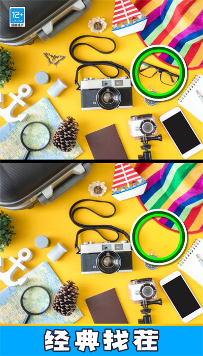 道具辅助找茬,例如放大镜、提示机会等,帮助玩家突破难关。游戏提供了多种实用道具,玩家可以通过完成关卡获得这些道具,在关键时刻使用它们可以事半功倍。