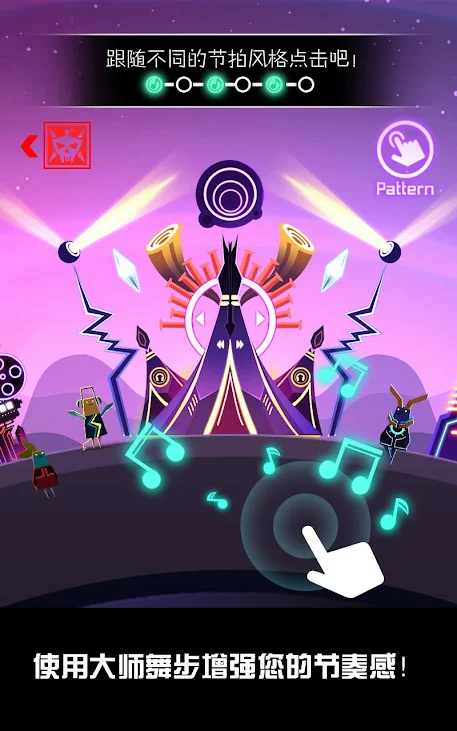游戏内置了智能AI导师,会实时分析玩家的节奏感,并提供个性化训练建议。通过收集音乐能量,玩家可以解锁特殊建筑,如"超频塔"能提升点击收益,"韵律花园"则能自动产生能量。