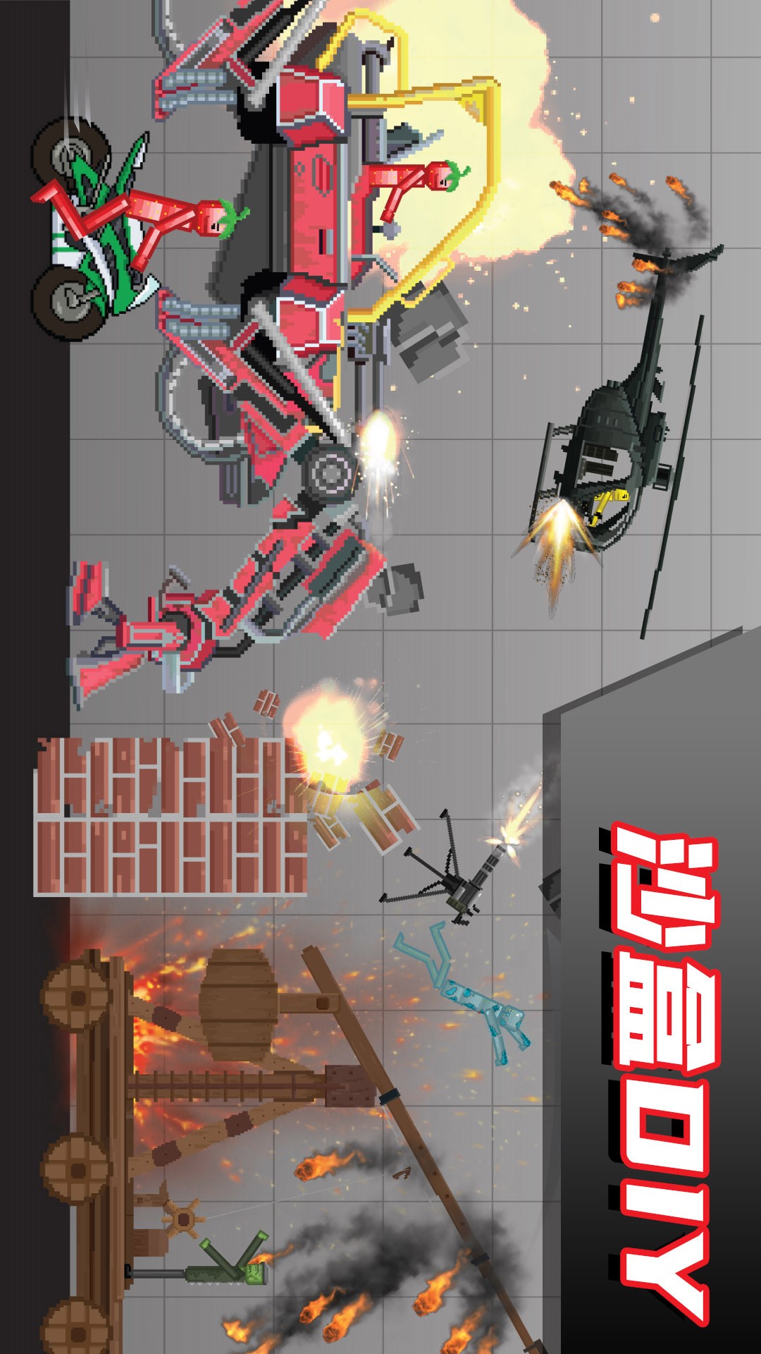 本作收录了超过200种武器和道具,从经典手枪到未来科技武器应有尽有。冷兵器爱好者可以挥舞巨斧或投掷飞镖,爆炸物爱好者则能体验火箭筒和C4炸药的威力。特别值得一提的是新增的载具系统,玩家可以驾驶坦克、直升机甚至外星飞船进行战斗。所有武器和道具都拥有独特的物理特性和使用效果,玩家可以自由组合搭配,创造出令人惊叹的战斗效果。