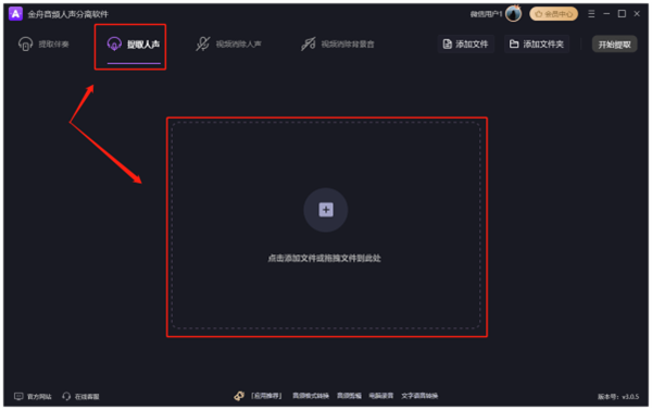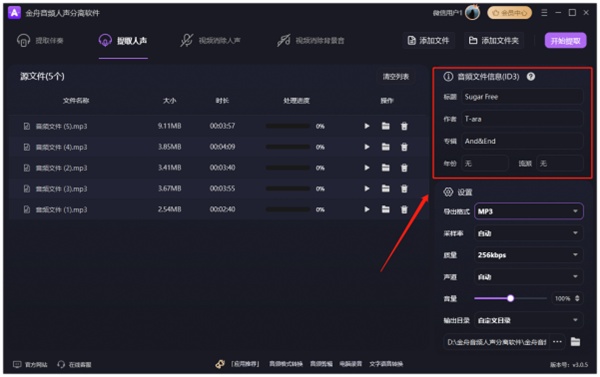 打开软件后选择"提取人声"功能,点击界面空白处添加需要处理的歌曲或视频文件。软件会自动识别文件信息,用户可根据需要修改歌曲的ID3信息(注意:ac3、amr、m4r、wav格式不支持修改)。