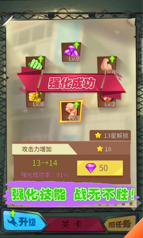 用拳头为自己赢得荣耀,在不同的关卡中击败更多对手,你的名气会随着胜利不断攀升。每个关卡都有独特的守关对手,只有战胜他们才能解锁新的挑战,而完美达成三星任务才能获得最丰厚的奖励。连击系统是游戏的核心玩法,保持连续攻击不仅能打出更高伤害,还能触发狂暴状态,让你在短时间内获得压倒性优势。游戏还定期推出特殊活动关卡,参与活动可获得限定皮肤和稀有道具。