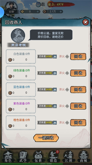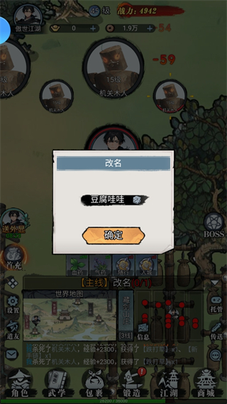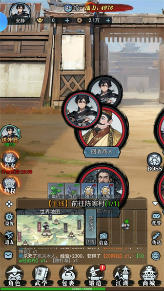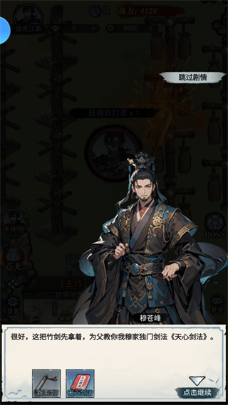 当玩家的等级达到一定程度后,玩家可以选择去外面的世界闯荡,也可以在设置页面选择挂机收物资。开放世界地图包含众多隐藏任务和奇遇事件,探索过程中可能遇到绝世高人传授武功,或是发现稀世珍宝。