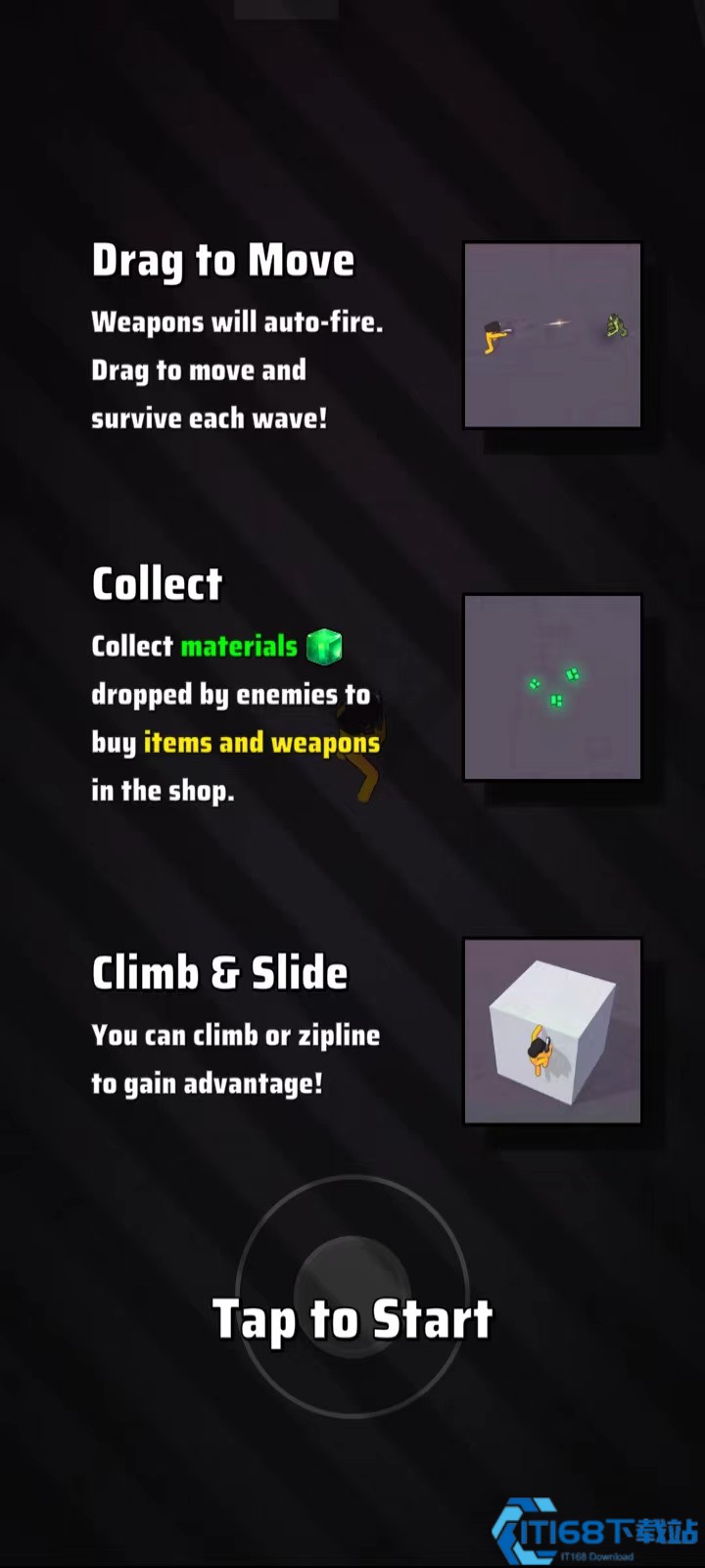 之后,玩家可以看见下图这个简易的游戏攻略,点击【taptostart】进入游戏。攻略中包含了游戏的基本操作说明和战斗技巧,建议新手玩家仔细阅读。游戏采用直观的触控操作方式,通过简单的点击和滑动就能完成各种复杂的动作。随着游戏进程的推进,玩家将解锁更多高级操作技巧。