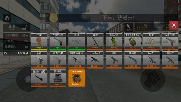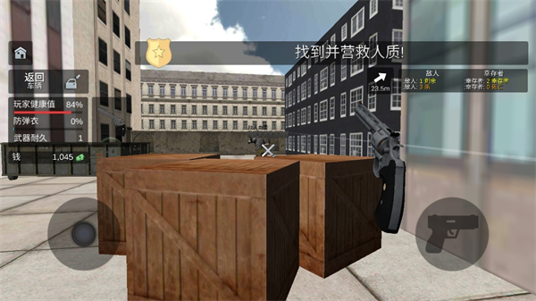 当人物下车后,操作方式会改变,画面左侧为移动键,右侧为攻击键/开火键。步行模式下的操作同样直观易上手,还加入了掩体系统和战术动作,让追捕罪犯的过程更具策略性和紧张感。