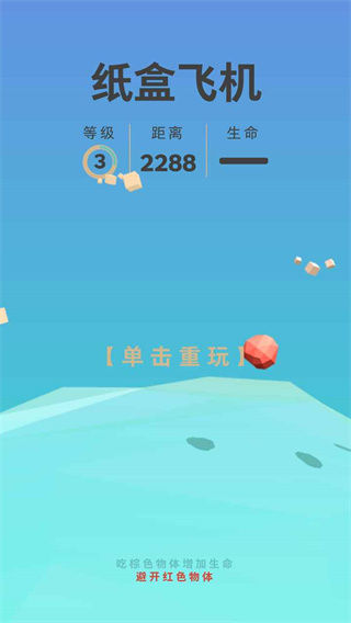 玩家只需要点击屏幕中间的单机重玩,吃棕色物体增加生命避开红色物体,游戏上方显示的是当前玩家的等级,距离还有生命。棕色物体能为玩家提供额外的生命值保障,而红色物体则需要小心避开,否则会减少生命值。