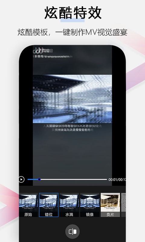 特效编辑:精美滤镜、视频特效、视频镜像、画中画...让你的视频秒变高大上,蔷薇、少女、暖冬、错位、浮雕、球面等各种类型,你值得拥有。特效叠加功能让创意无限延伸。