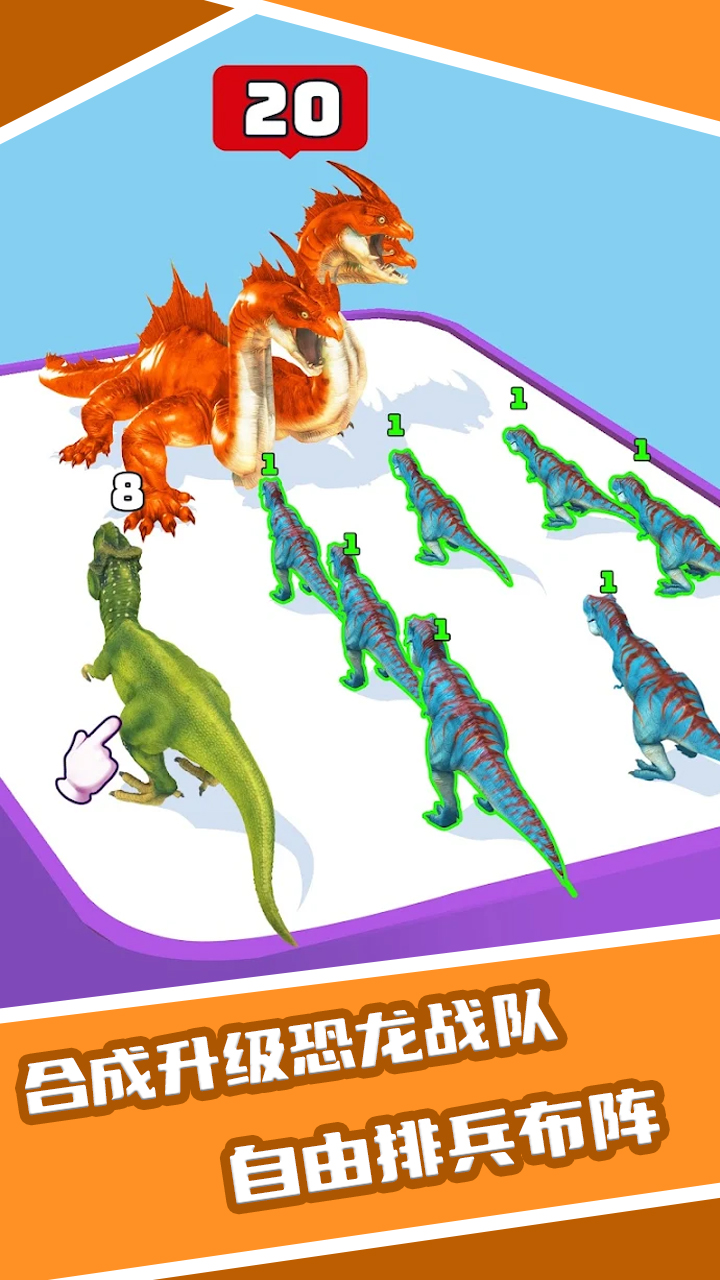 在《融合大师》中,你将拥有一支由各种恐龙和奇幻生物组成的强大军团。游戏的核心玩法是将这些生物带到战场上,通过合成和策略来赢得胜利。你可以将两只相同等级的恐龙合成为一只更强大的新恐龙,这种进化不仅会提升它们的属性,还会解锁新的技能。战场上的局势瞬息万变,你需要根据敌人的阵容及时调整战术,合理搭配远程攻击、近战肉盾和辅助单位。游戏还提供了丰富的冒险模式,让你可以带领恐龙军团探索未知领域,挑战更强大的敌人。每一次战斗都是新的开始,每一次合成都能带来惊喜,快来体验这场充满策略与乐趣的恐龙冒险吧!