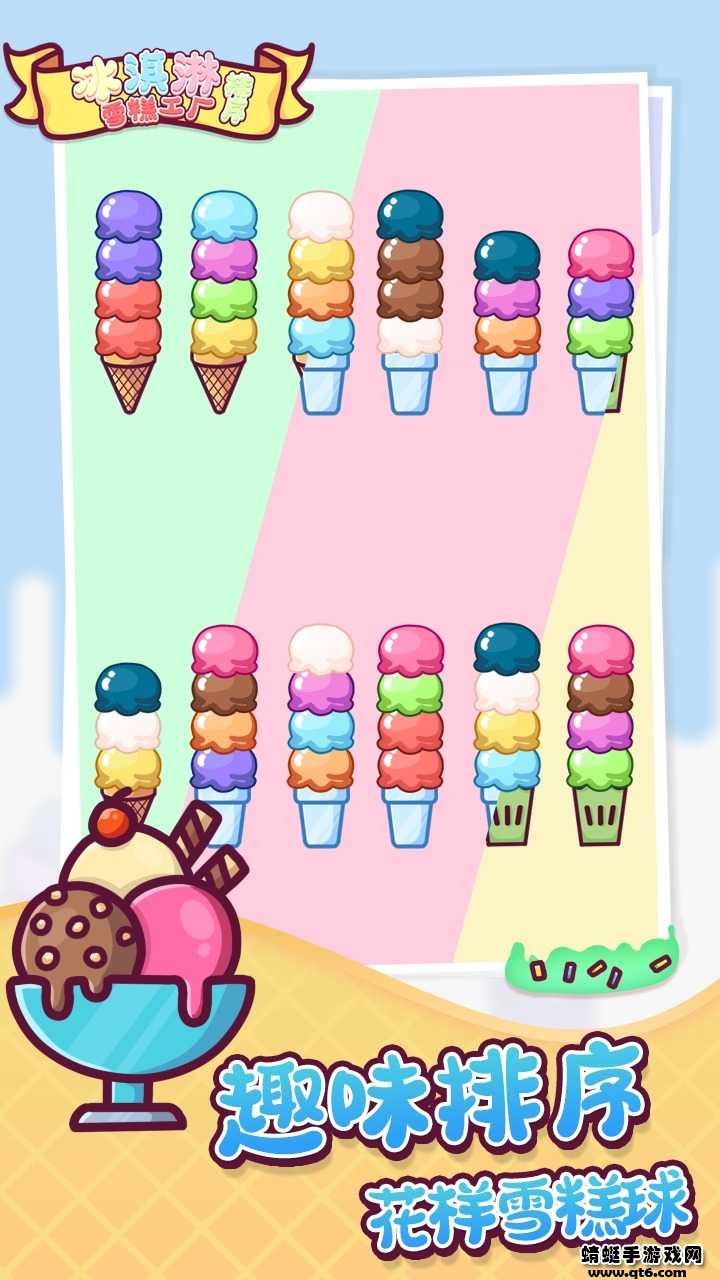 冰淇淋雪糕工厂排序游戏是一款充满童趣与挑战的休闲益智游戏,它以清新可爱的画风吸引了众多玩家。游戏的核心玩法借鉴了经典的球球排序模式,但进行了创新性的改造——将原本的彩色球球替换成了令人垂涎的冰淇淋球。玩家需要在游戏中将不同颜色的冰淇淋球进行分类整理,通过巧妙的移动将它们放置在对应的容器中。这种看似简单的玩法实则蕴含着丰富的策略性,既能让玩家放松心情,又能锻炼逻辑思维能力,非常适合全年龄段玩家体验。