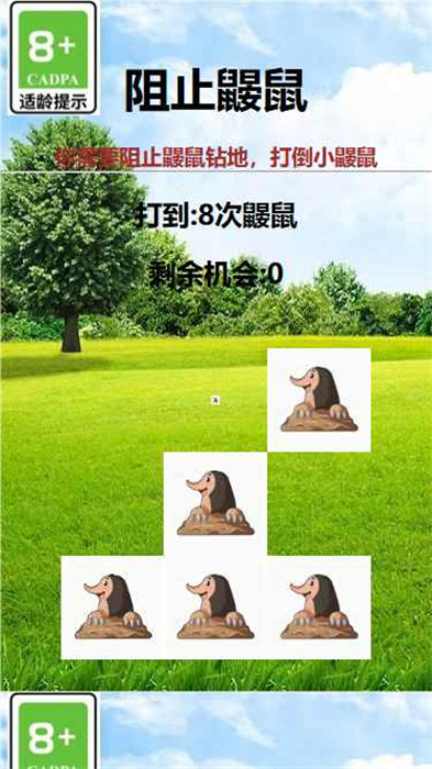 《阻止鼹鼠》是一款充满趣味的休闲益智游戏,玩家将化身为机智的鼹鼠猎人,通过精准点击来阻止调皮鼹鼠的破坏行动。游戏采用简单易上手的操作方式,玩家只需在鼹鼠冒头的瞬间快速点击即可获得分数。随着关卡推进,鼹鼠出现的速度会越来越快,考验玩家的反应能力。这款游戏不仅适合休闲娱乐,还能有效锻炼手眼协调能力,是打发碎片时间的绝佳选择。清新可爱的画风搭配轻松欢快的背景音乐,为玩家带来愉悦的游戏体验。