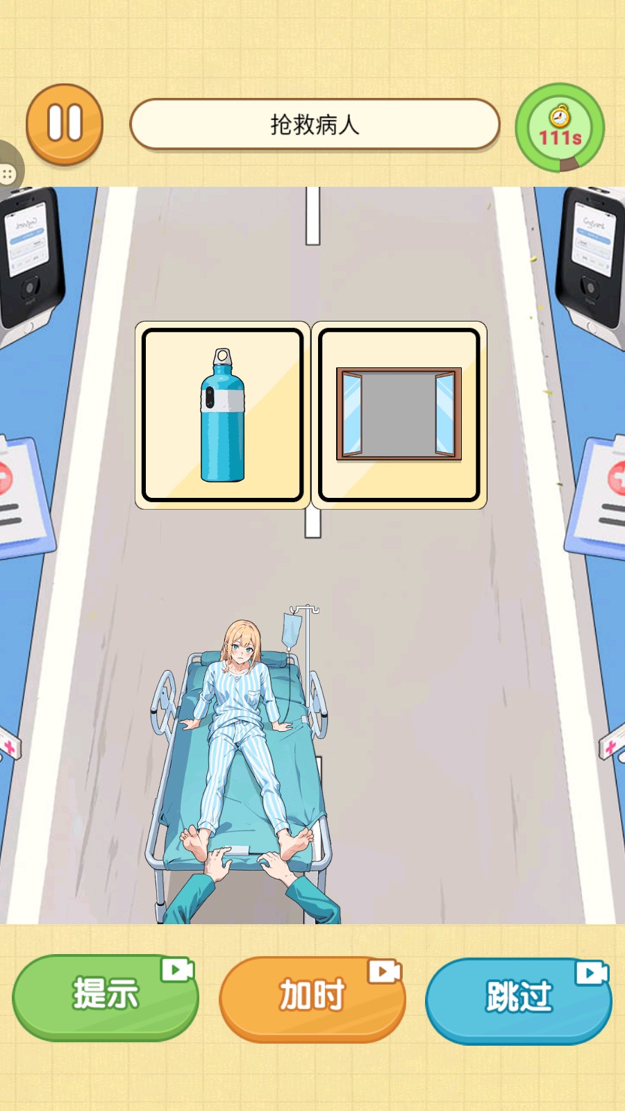 游戏界面上方会显示醒目的倒计时条,玩家必须在限定时间内,根据病人当前状态,从太阳、输液架等多种图标中选择最合适的施救方案。每个选择都会直接影响病人的恢复进度。