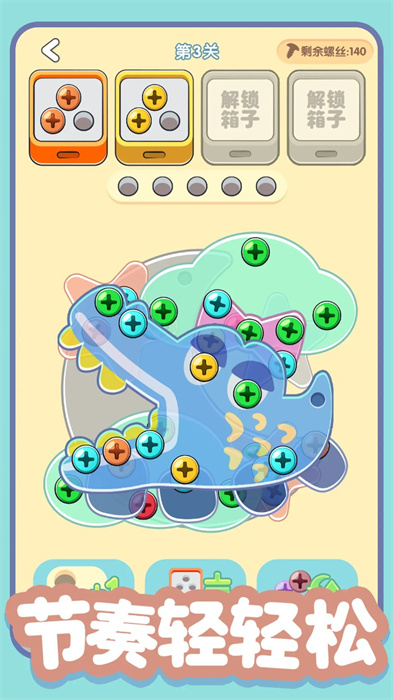 螺丝全拧掉通过独特的拧螺丝消除机制,为玩家打造了一个完美的解压空间。游戏中,你需要专注地将五颜六色的螺丝按照颜色分类放入对应的收纳盒,这种重复而有序的操作过程能够有效舒缓压力,让玩家在繁忙的生活中找到片刻的宁静。