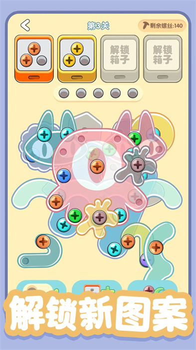 进入游戏后,系统会自动引导你进入第一关。游戏界面设计简洁明了,所有操作都通过点击完成。你需要仔细观察当前关卡的螺丝分布情况,然后按照游戏提示进行操作。