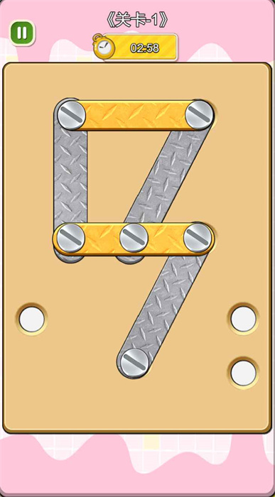 通过把螺丝移动到合适的位置让木条掉落,随着关卡等级的提升难度也会增加,完成目标任务通过关卡。中后期关卡会出现可移动的木板、弹性绳索等复杂机关,玩家需要综合考虑多种因素才能找到最佳解决方案。