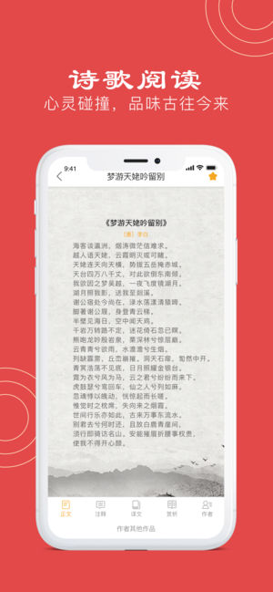 身边的良师益友。除了传统诗词,还收录了大量现代诗歌和外国诗歌译本,满足不同用户的阅读需求,真正实现"一APP在手,诗书我有"。