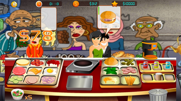 玩家需要根据顾客的订单制作汉堡,选择合适的配料并快速完成,以满足顾客的需求,获得最多的利益。游戏采用真实的汉堡制作流程,从面包烤制到配料搭配,每个步骤都需要精准操作。随着等级提升,还能解锁更多高级食材和特殊配方,让你的汉堡更具特色。