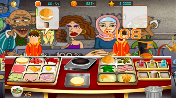 多种食品配料可以灵活组合,可以开发新产品,吸引更多顾客前来消费,更容易完成;游戏拥有超过100种食材选择,包括各种肉类、蔬菜、酱料和配菜。通过创新配方系统,玩家可以研发特色汉堡,申请专利保护,打造独树一帜的店铺招牌。