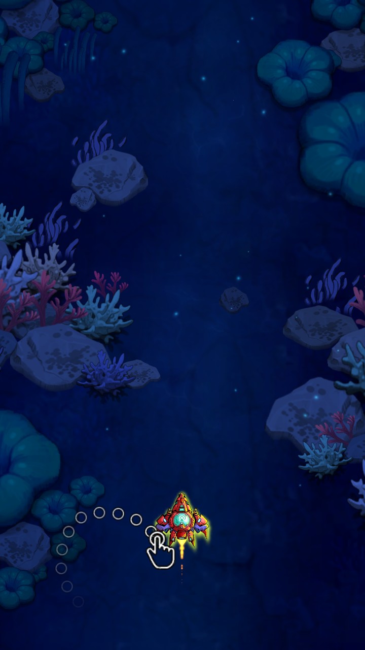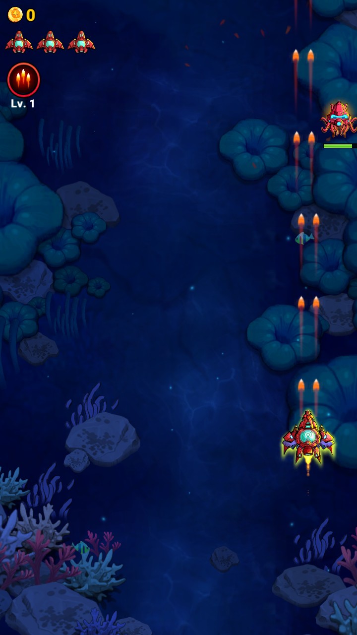 操控采用重力感应与虚拟摇杆双模式,潜艇会持续发射蓝色追踪弹幕。首批出现的红色章鱼敌人行动轨迹呈波浪形,建议保持中距离进行周旋。注意收集击落敌人后散落的能量晶体,这些资源可用于后续强化。