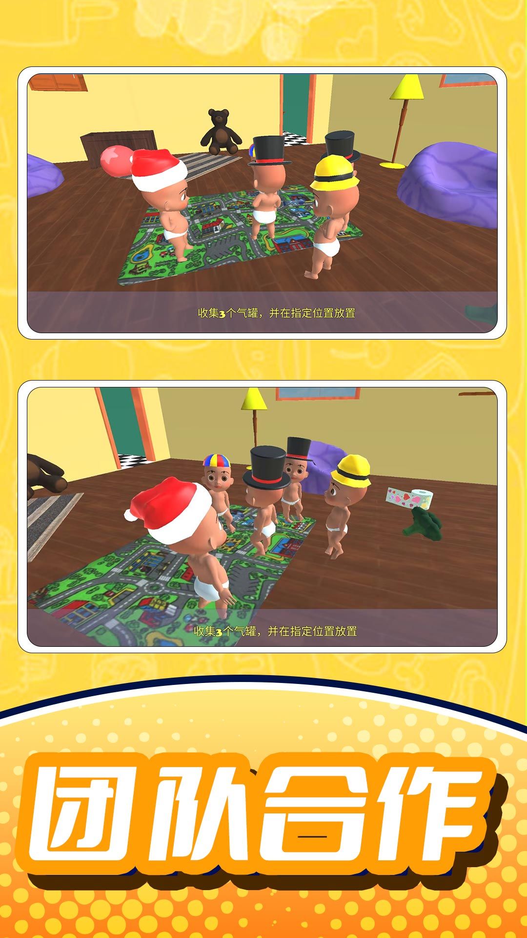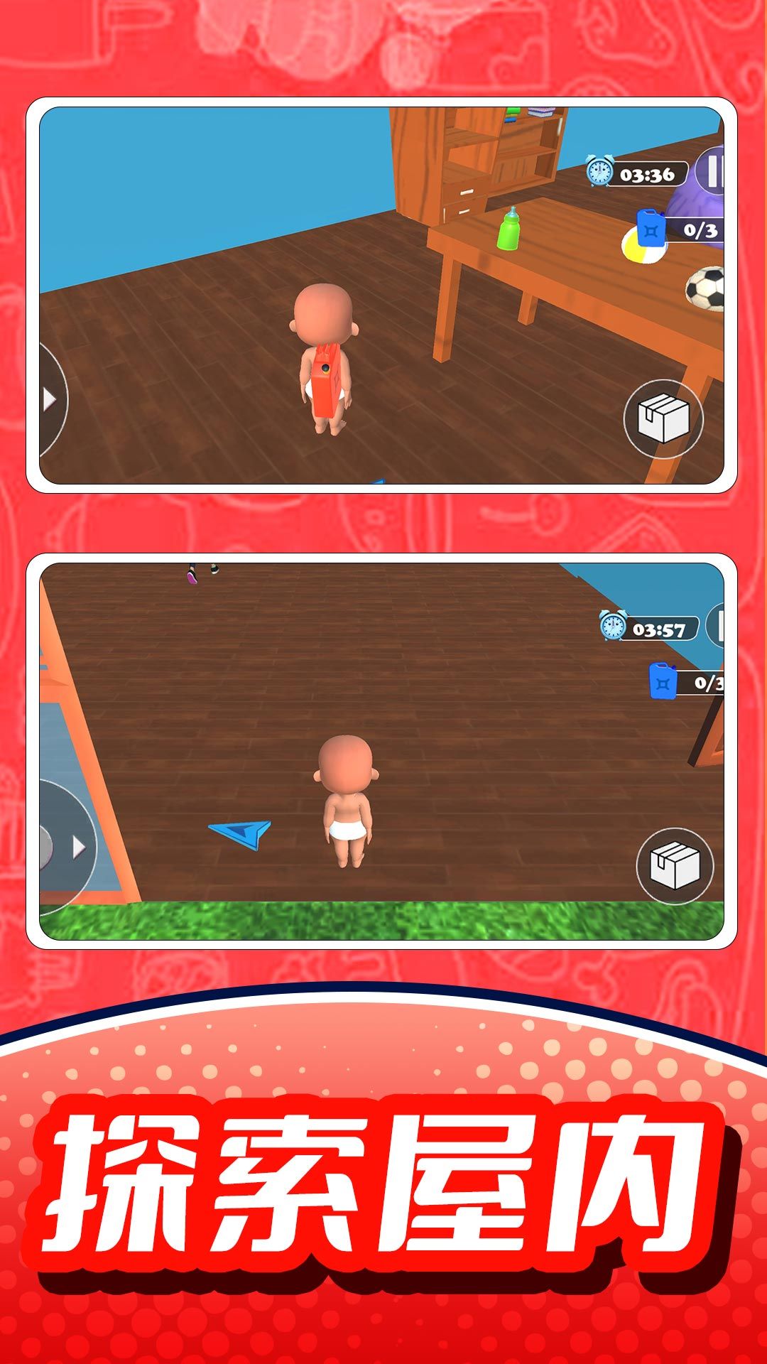玩家需要四处进行探索,解决面临的各种危险,认真的搜寻每个房间,去目标物品,可以获得一定的线索,在这个过程中还会遇到其他的小宝宝,大家一起合作,共同完成任务。游戏场景设计丰富多样,从温馨的婴儿房到神秘的阁楼,每个区域都隐藏着独特的挑战和惊喜。随着游戏进程的推进,玩家将解锁更多有趣的互动元素。