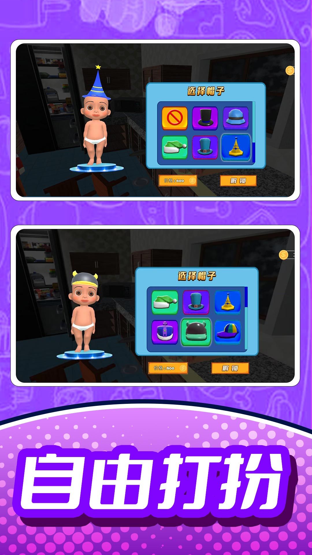 自由打扮你的婴儿形象,换上不同的帽子以及衣服,随心所欲。丰富的装扮选项让玩家可以打造出独一无二的宝宝形象。