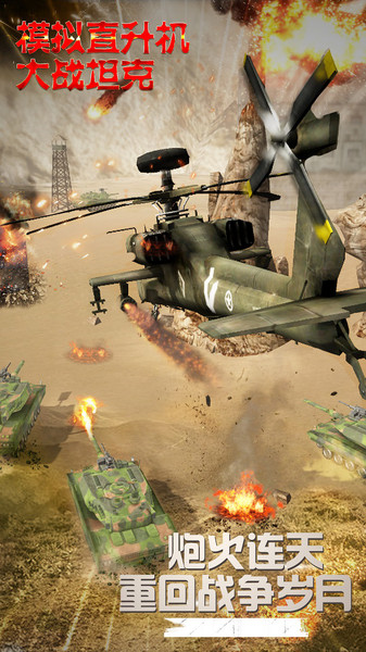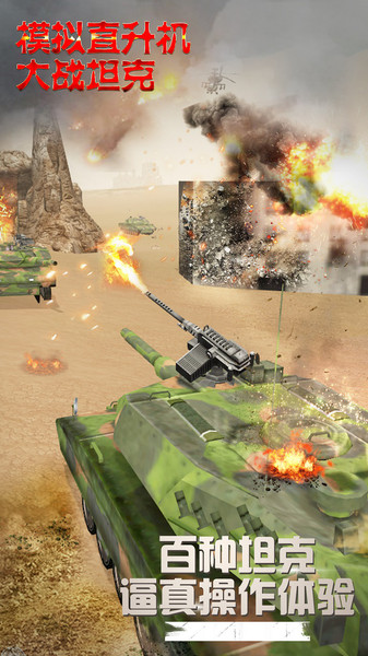 模拟直升机大战坦克是一款令人热血沸腾的3D战场射击手游,将带您进入一个充满硝烟与激情的虚拟战场。在这款精心打造的军事模拟游戏中,您不仅能体验到逼真震撼的战场氛围,还能操控高度还原的现代坦克与武装直升机。游戏采用先进的3D引擎技术,无论是爆炸特效、物理碰撞还是环境细节都达到了手机游戏的顶尖水准,让您仿佛置身于真实的现代战场之中。