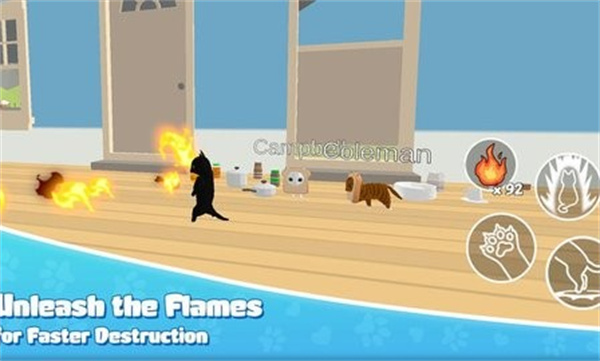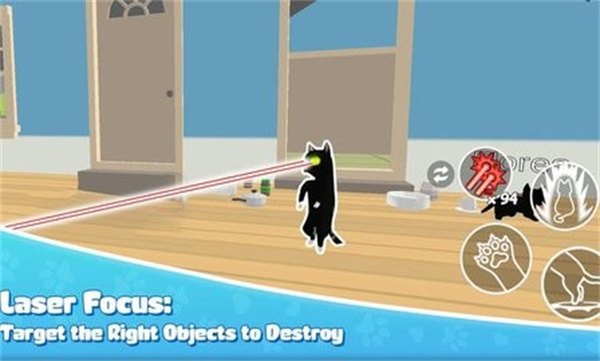 游戏场景中充满了可互动的物品,从客厅的沙发到厨房的餐具,几乎每样东西都能成为你的"玩具"。特别设计的破坏系统让每个物品都有独特的破坏效果,抓破沙发会露出里面的填充物,推倒花瓶会有逼真的碎片飞溅。游戏不仅还原了猫咪常见的恶作剧行为,还加入了夸张的幻想元素,比如解锁特殊能力后可以用激光眼烧毁物品,或是喷出火焰制造混乱。随着游戏进程,你会发现更多隐藏的破坏方式,每个房间都藏着意想不到的互动可能。