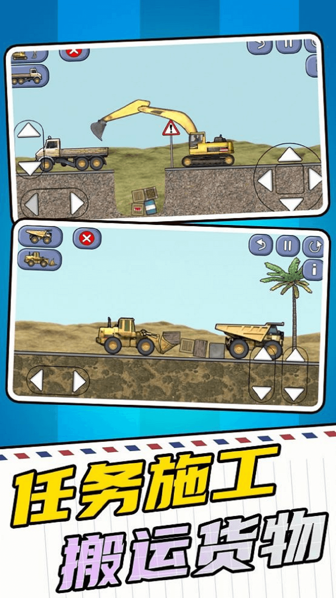 通过摇杆或重力感应操控工程车移动,左屏调整视角,右屏使用机械臂、铲斗等专用工具完成挖掘、装载等。游戏独创双模控制系统,既支持街机式的简化操作,也提供专业级的液压模拟,玩家可自由切换不同难度。在进阶模式中,甚至需要手动调节挖掘机配重块来保持平衡,真实还原现实工程中的操作细节。