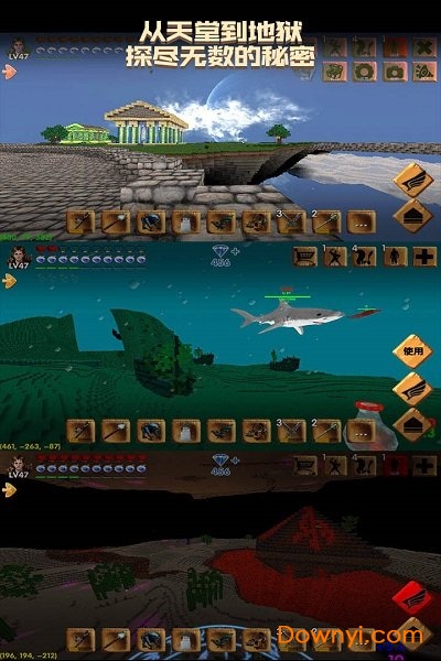 游戏世界拥有令人惊叹的地形生成系统,包括地狱般的熔岩地带、漂浮在空中的神秘岛屿、被遗忘的天空之城、深邃的地下世界和色彩斑斓的珊瑚礁群。随身携带的手电筒将帮助你安全穿越黑暗的洞穴系统。装备系统丰富多样,你可以佩戴"我的宝贝"这样的强力戒指,或是装备脚蹼提升游泳速度。游戏世界不仅在水平方向无限延伸,垂直方向也同样充满探索空间。25个精心设计的任务目标将引导新手玩家熟悉游戏,同时提供数小时的娱乐体验。通过升级和分配技能点,你可以不断强化角色能力。游戏包含87种栩栩如生的怪物,从小巧的蜥蜴到凶猛的巨龙,从温顺的小丑鱼到恐怖的巨鲨应有尽有。精美的画面表现配合多彩的光影效果,加上震撼的夜空和逼真的地形碰撞,共同营造出令人沉醉的游戏世界。游戏提供4种控制模式:操纵杆、双操纵杆、加速度计和D-pad,满足不同玩家的操作习惯。未来更新还将加入汽车和船只等交通工具,方便长途旅行。武器系统极其丰富,包括各种剑、魔法装备、盾牌、枪支、弓箭等。开发团队承诺保持每周1次的更新频率,持续为玩家带来新内容。