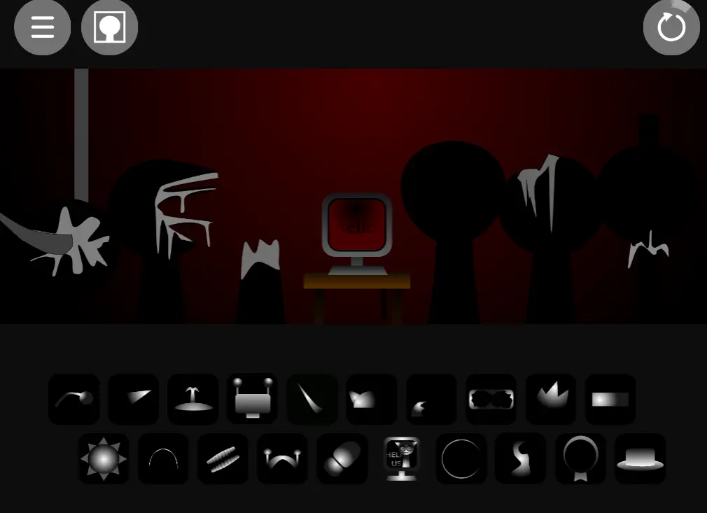 打开游戏后,玩家可以从底部选择数十个不同的图标拖拽到角色身上。每个图标都代表独特的音乐元素,拖放后角色会立即开始演唱并做出相应的表情和动作。游戏最大的特色在于其恐怖模式,当玩家将最后一个黑帽子图标拖到角色上时,整个游戏氛围会发生戏剧性的转变。操作简单直观,但需要玩家掌握好节奏感才能创作出完美的音乐作品。新手玩家可以先从简单的组合开始尝试,逐步解锁更多有趣的玩法。