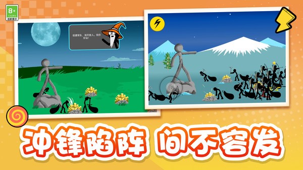 多样化的英雄和兵种配置,精彩的剧情设定,玩法创新。游戏不仅拥有丰富的角色选择,还融入了独特的成长系统,让玩家在战斗中逐步解锁更多强力单位。超级刺激的打斗场景和特效,操作简单流畅,游戏画面精致。每一场战斗都伴随着炫酷的技能释放和华丽的打击效果,带来视觉与操作的双重享受。在游戏中可以训练出弓箭手、法师等强大火柴人兵种,每种兵种都有其独特的战斗风格和技能组合,为战术搭配提供了无限可能。战斗开始用仅有的矿工进行采矿,用获得的金币来召唤你需要的兵种进行战斗,这种资源管理机制让游戏更具策略深度,考验玩家的即时决策能力。