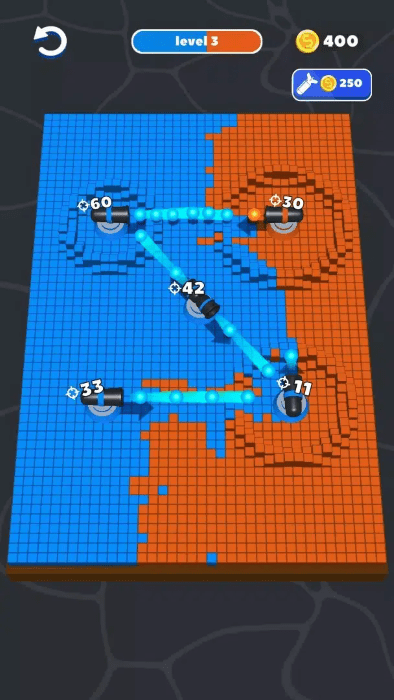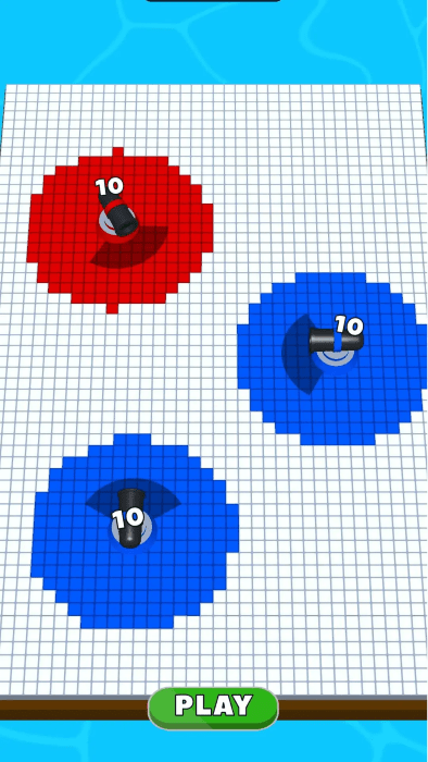 游戏操作简单易上手,首先点击PLAY按钮进入游戏界面。玩家通过滑动屏幕来控制炮台的射击方向和力度,精准的瞄准可以让你更高效地占领地盘。游戏还支持蓄力射击功能,长按屏幕可以将射击范围集中到一个点,实现更精准的打击效果。最特别的是炮台之间可以传递炮弹,合理利用这个特性可以创造出意想不到的战术效果。