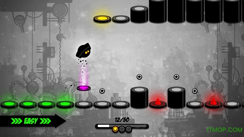 作为一款以节奏为核心的游戏,《永不言弃2》的音乐表现尤为出色。每首背景音乐都经过精心编排,与关卡设计完美融合。玩家必须全神贯注地跟随音乐节拍进行操作,因为在这个世界里,节奏就是一切。游戏操作机制看似简单:点击屏幕让小墨点跳跃。但实际上,玩家需要应对各种复杂情况:红色障碍物需要提前点击绿色目标才能翻越;高低不一的支柱需要精准把握跳跃力度;连续出现的障碍物则考验玩家的反应速度。这些设计让游戏既保持了简单易上手的特性,又具备了足够的深度和挑战性。