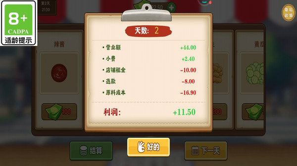 结算画面显示每日收益详情,包含营业额、小费、租金与成本,玩家可据此调整经营策略以提升利润。通过分析数据,你可以优化菜单和定价,吸引更多顾客光顾你的煎饼摊。
